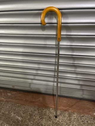 Elegante bastón artesanal con un diseño clásico. - Mango curvo de color amarillo. - Cuerpo principal de color plateado. Acero inoxidable