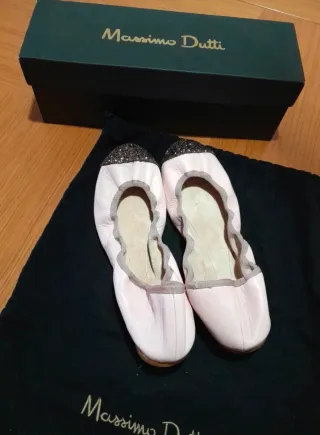 Elegantes bailarinas de piel de Massimo Dutti. - Color rosa con detalles plateados. - Diseño tipo manoletina. - Incluye bolsa guardapolvo de la marca y caja, están sin usar