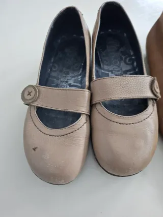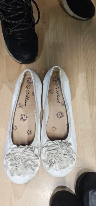 Preciosas manoletinas para niña con un diseño delicado. De muy poco uso. Un poco rozadas despues de una noche de baile - Cierre de tira con hebilla. - Detalle festoneado en el borde. - Tira cruzada en el empeine.