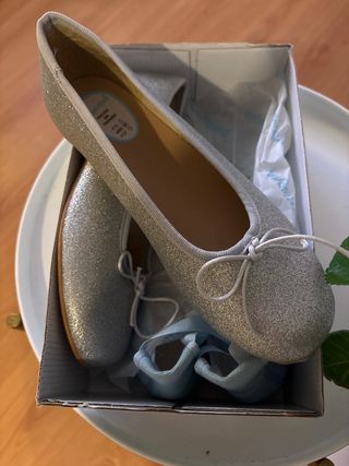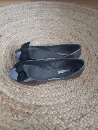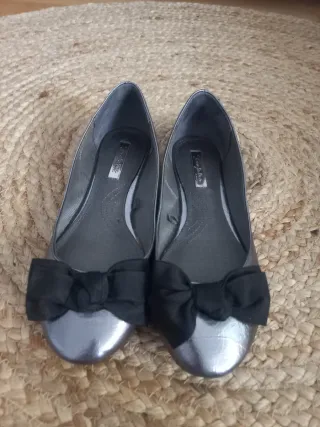 Manoletinas de la marca Zara, talla 39 - Color plateado con detalle de lazo negro. Muy cómodas