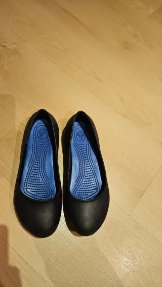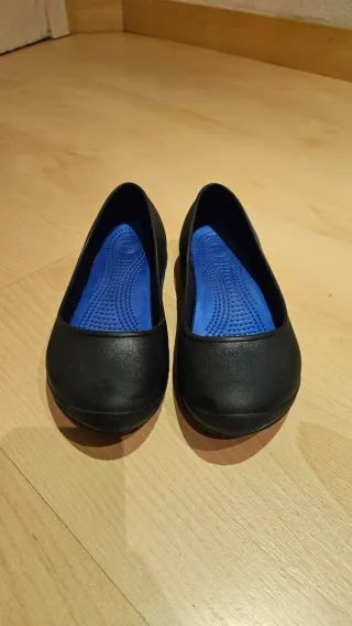 Manoletinas cómodas y versátiles. - Color negro. - Interior azul con plantilla texturizada. - Diseño tipo bailarina. - son de goma (material de crocs) por lo que no se mojan y son muy muy ligeras