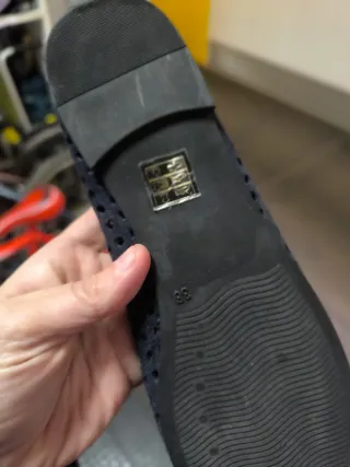 Manoletinas Camper con cinta elástica en la parte superior. Talla 37. En perfecto estado. Color gris oscuro con el logo Camper y detalles de peces en la suela. Fallo de impresión en el logo de la plantilla interior izquierda.