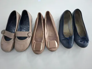 Conjunto de 2 pares de manoletinas para mujer. La azul de la derecha se ha vendido. - Un par en color beige con detalle de botón. - Otro par en color beige con hebilla metálica. - Un par en color azul marino con lazo. VENDIDA