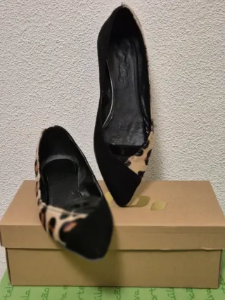 Manoletinas de Sfera, sin estrenar. Un diseño elegante y moderno. - Punta afinada. - Detalle de estampado de serpiente en la puntera. - Material exterior de ante. - Suela interior cómoda. Me mudo y necesito desprenderme de ropa y objetos, mira mi perfil por si te puede interesar algo más 😉