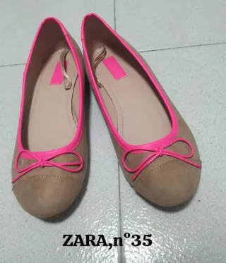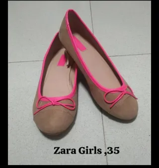 Manoletinas de Zara Girls, número 35, cómodas y con un diseño juvenil. Detalle de lazo en la puntera. Ribete en color fucsia.Material exterior efecto ante . Apenas usadas, perfecto estado.Como nuevas !!