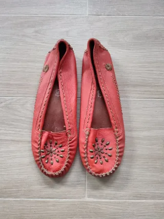 Manoletinas de piel en tono naranja rojizo, con un diseño original. - Material: Piel muy blandita y cómoda. - Detalle de tachuelas en la puntera y en la parte superior. - Costuras decorativas. - Diseño tipo mocasín.