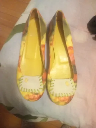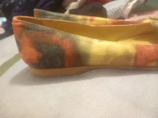 Manoletinas de la marca Ursula Mascaró en talla 36. Un calzado llamativo con un diseño vibrante. - Diseño multicolor con base amarilla. - Detalle de pespuntes en la puntera. - Adorno cuadrado en la parte delantera.