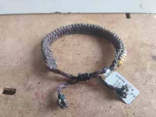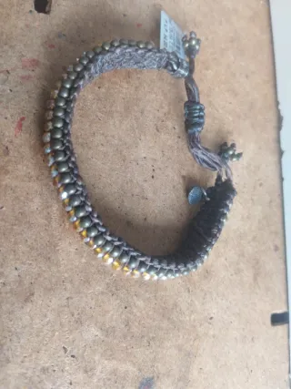 Pulsera artesanal con un diseño único. - Elaborada con cuentas metálicas y detalles en tonos dorados. - Base de cordón trenzado.