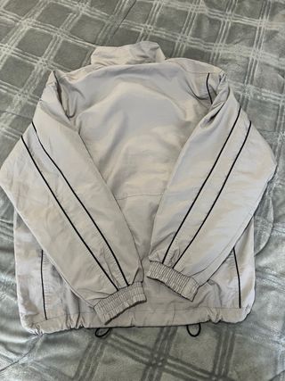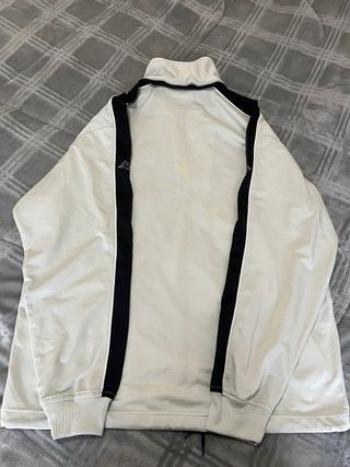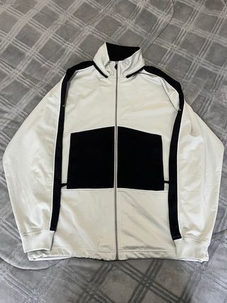 Chaqueta deportiva estilo retro. - Diseño bicolor en blanco y negro. - Cuello alto con cremallera. - Puños y bajo elásticos. Tiene una pequeña mancha en una manga (ver fotos) que se iria facilmente con quitamanchas.
