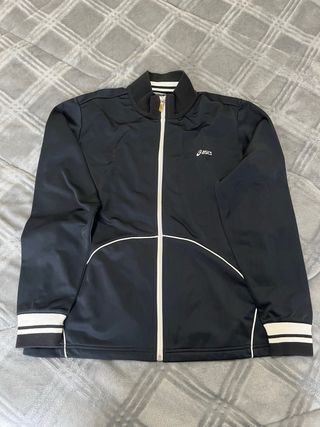 Chaqueta deportiva retro de la marca Asics. - Diseño clásico con detalles en las mangas. - Cremallera frontal completa. - Bolsillos laterales. - Cuello alto.