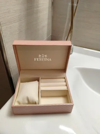 Elegante joyero de viaje con un diseño acolchado. Medidas: 14'5 cm ancho, 11 cm hondo y 6 cm altura - Marca: Festina - Color: Rosa satinado - Ideal para organizar tus joyas mientras viajas.