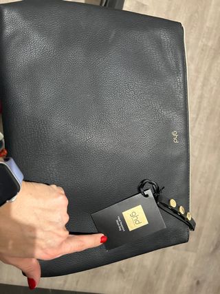 Bolso piel Genuina,combinada con piel girada, tachuelas de piel y perlas delante , bolsillo con cremallera detrás, dentro otro bolsillo abierto,cadena que se puede hacer doble para llevarlo,de mano o colgado según se desee. Cierre botón imantado. Precioso ! Sin estrenar y con etiqueta. Medidas: Largo 23,5 cm Alto 18 cm Ancho 6 cm ⛓️ 50cm aprox. - Adornado con tachuelas plateadas. - Diseño con tiras de piel. - Cierre de botón a presión.
