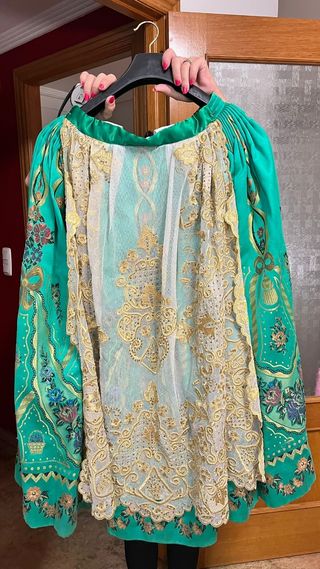 Vendo traje de fallera del siglo XIII y corpiño. El corpiño verde tiene la manteleta y y las puntillas para cambiar. Se cambió la manteleta de la falda. Está listo para usar con el corpiño amarillo bordado con las flores del fondo verde. Se puede probar sin compromiso y negociar.
