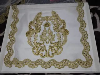 Elegante mantilla de encaje con detalles dorados. - Diseño triangular. - Borde festoneado con hilo dorado. - Adornada con lentejuelas.