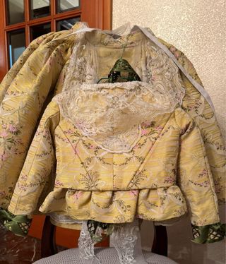 Traje de fallera del S.XVIII, el tejido es un corte estrecho. Color muy luminoso y favorecedor, en perfecto estado. Manteletas incluidas en el precio, así como zapatos de tacón de la talla 38, aderezo no incluido.
