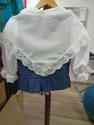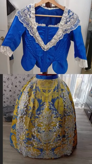 Traje de fallera con dos cuerpos, el azul con manteleta i el blanco sin manteleta - Sin delantal Medidas de la falda: Cintura 62 más o menos Largo 103 Medidas cuerpo azul: Largo espalda 40 + volante 51 Largo manga 57 Ancho pecho 76 Medidas cuerpo blanco i azul: Largo espalda 38 + volante49 Larga manga 30 Ancho pecho 76 Precio negeciable