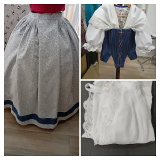 Conjunto tradicional de huertana, fallera ,valenciana, las manteletas van sueltas, no cosidas al traje. Nuevo a estrenar Coteta, envarillada con esparto, con mangas cosidas con encaje - Tejido con textura de rayas verticales, color gris azulado Medidas Pecho 89cm Cintura 78cm Talle espalda 38cm Ancho espalda 30 cm Pecho delantero 48 Falda 99 cm de largo, 3 caídas Cintura 76cm, hay bastantes centímetros de margen regulable, más o menos Muy ligero