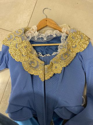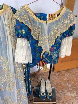 Traje de fallera azul con detalles dorados. Talla 38-40 aproximadamente (lleva manga larga) la manteletas llevan mucho dorado a juego con el estampado del traje. - Delantal y corpiño con encaje y bordados dorados. - Mangas abullonadas con encaje. - Cuello de encaje con detalles dorados. - Incluye zapatos a juego. Tengo 3 trajes más en mi perfil