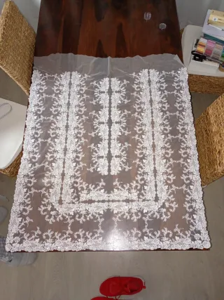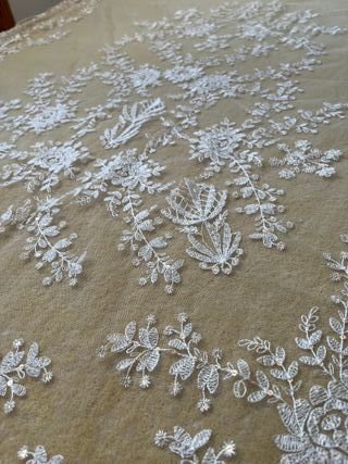 Manteleta fallera con un delicado bordado floral, para traje de adulta. Se vende solo la manteleta de la falda el pico no está disponible; como se puede ver en una foto tiene una leve manchita que apenas se ve. - Diseño intrincado con motivos florales y hojas. - Acabado con pequeñas lentejuelas brillantes. - Tejido de tul fino y resistente.