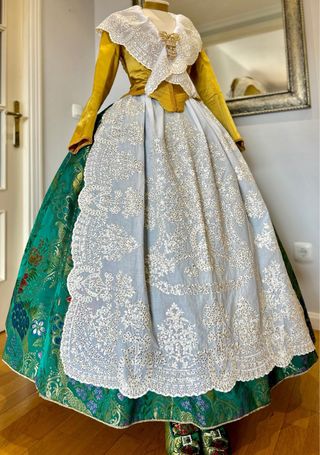 Medidas corpiño: -espalda: 42cm - manga: 40cm (media manga) Falda: Cintura: 87cm Largo: 104cm ( de cadera a tobillo) Traje de fallera completo, talla 34. Incluye manteletas y está confeccionado en un tejido verde - Manteletas a juego. - Talla XS / 34 / 6.