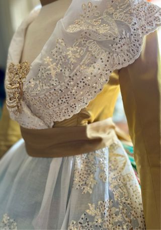Traje tradicional de fallera con manteletas nuevas Batista en tonos dorados. Dos corpiños uno manga larga para ofrenda. Otro con maga de farol para presentaciones y pasacalles. Manteletas y corpiño puede llevase a l’Antiga. Lazada nueva en tonos dorados para cintura y cuello. Medidas corpiños: -Manga de farol contorno de pecho entre 85 y 90 cm. -Manga larga 80cm de contorno de pecho. -Cintura de corpiño manga larga 80cm Largo de falda 103cm y se puede sacar 4 cm mas Regalo Zapatos Tela para forrar otro zapatos