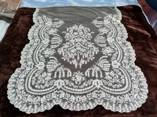 Elegantes manteletas de encaje con detalles bordados en hilo dorado. - Diseño intrincado con motivos florales. - Borde festoneado. - Tejido ligero y delicado. - medidas delantar 75 x60