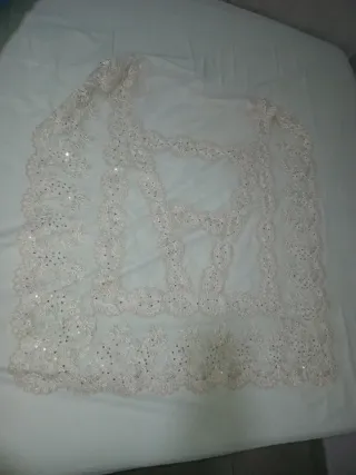 Manteleta fallera en perfecto estado, como nueva. Un accesorio elegante para tu traje regional. - Diseño intrincado con bordados dorados. - Adornada con pequeñas perlas y lentejuelas. - Tejido ligero y vaporoso.