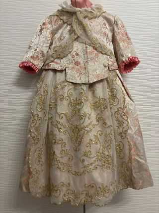 Precioso traje de fallera para niña, ideal para fiestas y celebraciones. - Diseño en tonos rosas y dorados - Manteletas en oro