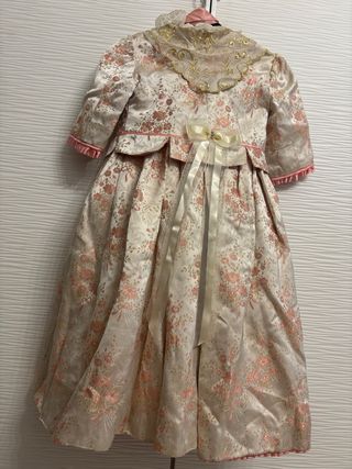 Precioso traje de fallera para niña, completo con manteletas. Un diseño elegante y tradicional. - Tejido brocado con motivos florales en tonos rosados. - Adornos dorados y lentejuelas. - Manteletas con detalles intrincados. - Mangas con volantes y lazo. - Cuello con puntilla.