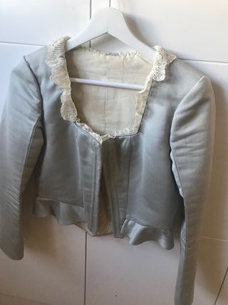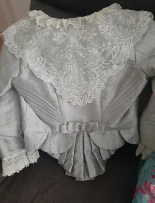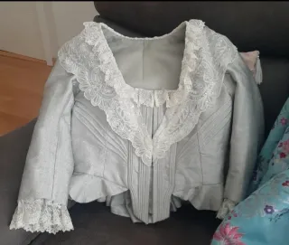 Corpiño de fallera en tono plata con detalles de encaje. - Diseño elegante con escote cuadrado. - Adornado con un delicado encaje en el cuello. - Bajo con volante. - Forro interior. tiene una mancha en la espalda, no he probado a quitarla. con la manteleta no se ve