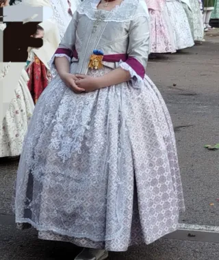 Traje de fallera para niña, adecuado para edades de 8 a 12 años. Un diseño elegante y tradicional. Lo vendo con dos corpiños, uno más pequeño y otro más grande, dos pares de zapatos de la talla 33 y 35. Manteletas y cancan incluido. Se puede probar sin compromiso. - Tejido principal en tonos plateados. - Detalles en morado