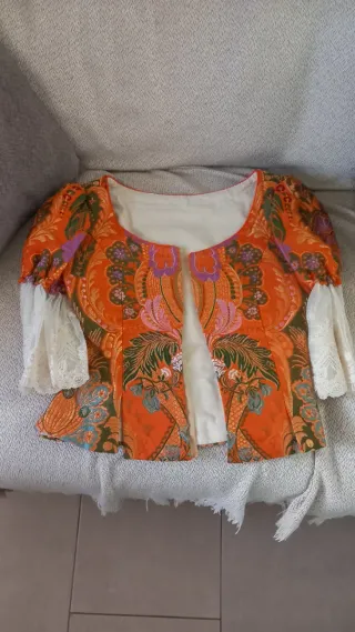 Corpiño de fallera naranja, con detalles verdes y morados. Tal y como se ve en las fotos. No incluye manteletas. Medidas: De hombro a hombro: 35 cm Largo: 48 cm