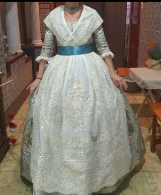 Traje tradicional de fallera con detalles elaborados. - Diseño en blanco con cinturón azul. - Tejido con bordados y pedrería.