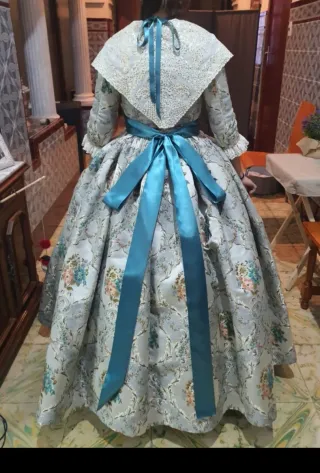 Traje de fallera confeccionado por Amparo fabra. - De color gris azulado - Traje en oro/ dorado - Talla 34-38 - Incluye manteletas
