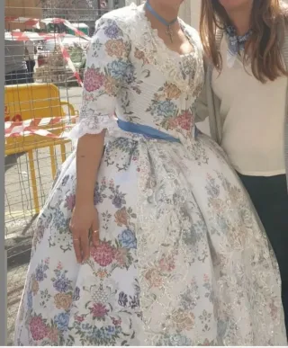 Traje de fallera completo en color blanco y plata, adornado con un delicado estampado floral. Hecho a medida, talla entre 38-40. Yo tengo espalda anch Lo llevo con cancán de 100cm Si necesitas medidas no dudes en pedirlas y sin problema quedamos un día para probarlo. Solo puesto para un pasacalles. Completamente nuevo. - Incluye cinta azul, manteleta y pico ( blancas y plata) -Zapatos de la misma tela, talla 40-41, super cómodos. Tengo tela de sobra para poder hacer un corpiño de chico a juego.