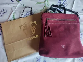 Bolso de ante en color granate de la marca Fosco. Un accesorio elegante y versátil. Cómo nuevo. Un sólo uso. - Material: Ante, piel. - Color: Granate. Se puede combinar con los botines también en ante granate. Completamente nuevos. Precio bolso 30€ Precio botines 30€ Precio conjunto bolso+botines: 50€ Se entrega en Manzanares el Real. También se puede entregar en Madrid en Las Tablas o en la zona de Embajadores. Se hacen envíos.