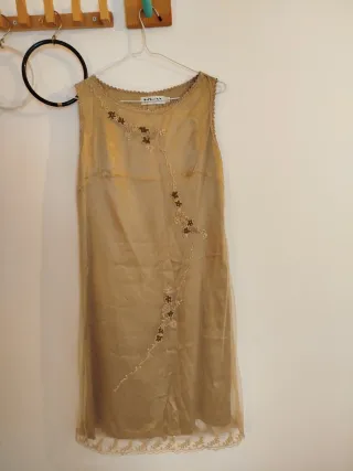 Elegante vestido de corte recto con un delicado bordado floral que recorre el frontal. La tela exterior es de tul y lleva un forro interior. Diseño sin mangas. Escote redondo con borde festoneado. Bajo del vestido con encaje.