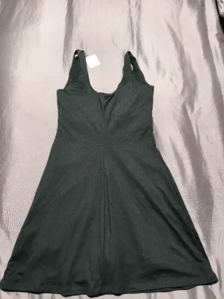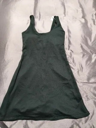Vestido de mujer de color verde. Diseño moderno y cómodo. - Tirantes finos. - Escote redondo. - Bajo con acabado acanalado.