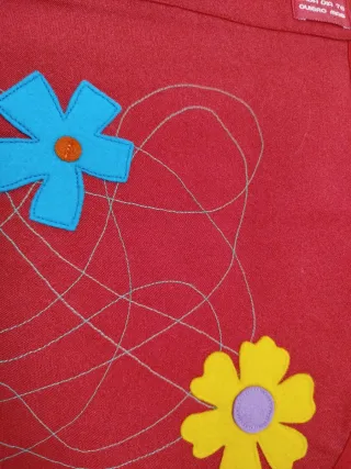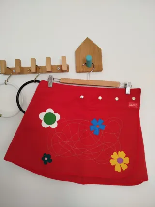 Minifalda roja con estampado de flores realizado de forma artesanal. Diseño con apliques de flores en blanco, verde, azul y amarillo. Hilo de bordado decorativo en forma de espiral. Cierre con botones a presión plateados que hace que la falda valga para una talla S y una M. Va a la cadera.