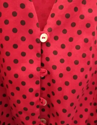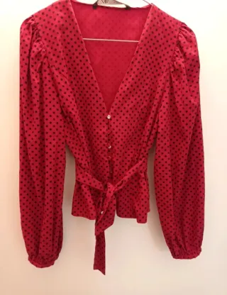Elegante blusa con estampado de lunares. Diseño con cuello en V. Manga larga abullonada. Cinturón para anudar a la cintura. Cierre de botones.