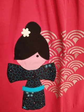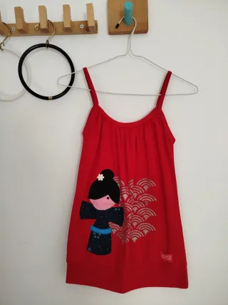 Camiseta roja de tirantes realizada artesanalmente. Estampado de una muñeca japonesa y ondas plateadas. Nueva.