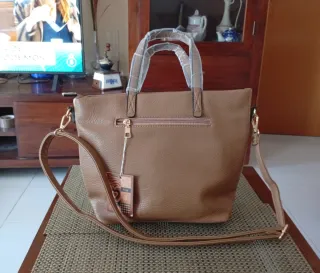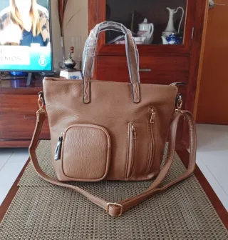 Bolso en color marron claro con varios bolsillos en el exterior con cremallera. Asa larga ajustable y dos asas cortas superiores. Bolsillos interiores. Medidas: 34cm largo x 26cm alto x 9,5cm fondo. Nuevo con etiqueta.