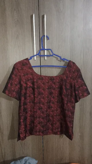 Blusa de manga corta con un estampado jacquard en tonos rojos y negros. Presenta un favorecedor cuello cuadrado. - Diseño con estampado geométrico. - Manga corta.