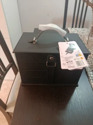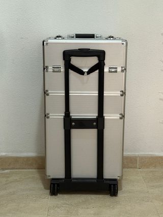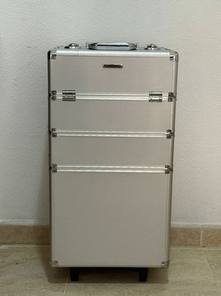Maletín de maquillaje con un diseño elegante y práctico. Ideal para organizar y transportar tus productos de belleza. - Acabado metálico. - Asa resistente para un fácil transporte. - Cierres seguros.