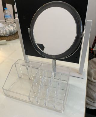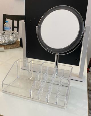 Práctico organizador de acrílico transparente para maquillaje. - Diseño con múltiples compartimentos. - Material acrílico resistente. - Ideal para escritorio o tocador.