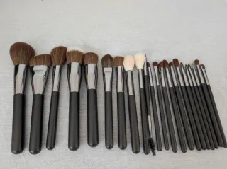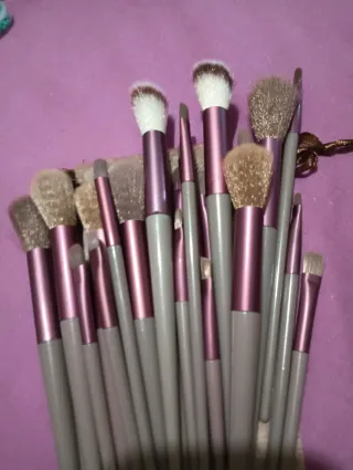 Conjunto de herramientas esenciales para maquillaje. - Incluye varias brochas para diferentes aplicaciones. - Varias esponjas de maquillaje. - Un par de pestañas postizas. - Un cepillo para cejas y pestañas.