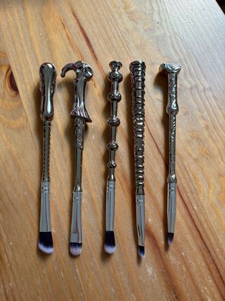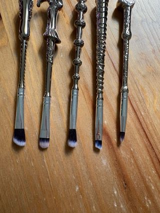 Conjunto de cinco brochas de maquillaje con mangos plateafo y cerdas marrones. Ideales para diferentes aplicaciones. NUNCA SE HAN USADO