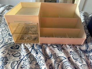 Práctico organizador de maquillaje con compartimentos superiores y cajones. - Diseño con múltiples divisiones. - Dos cajones transparentes. - Acabado en beige y blanco. MEDIDAS: -Largo: 19,5 cm -Profundidad: 16 cm -Ancho: 22,5 cm