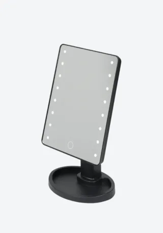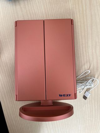 Espejo de maquillaje con luz LED integrado. Ideal para tu tocador. - Diámetro de 8 pulgadas. - Altura ajustable de 35 a 45 cm. - Incluye cables de carga USB.