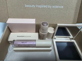 Lote de maquillaje que incluye dos coloretes/iluminador líquidos, una paleta de colorete y dos esponjas. Todo nuevo